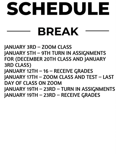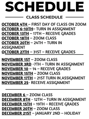 CLASS 1 INTERMEDIATE STARTS SATURDAY, OCTOBER 4, 2025, AND WILL RUN FOR TWELVE (12) WEEKS, WITH TWO WEEKS OF CLASSROOM TIME, 1 HOUR AND 15 MINUTES PER CLASS PER MONTH AND TWO WEEKS OF ASSIGNMENT WORKING AT YOUR OWN PACE AND MUST BE TURNED IN EVERY OTHER WEEK ON A DESIGNATED DATE